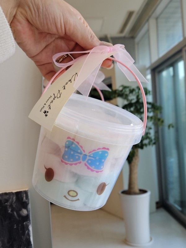 4. 수제 솜사탕은 귀여운 원형 통에 먹기 좋은 한입 크기의 동그란 모양으로 만들어졌으며, 약 19개가 담겨 있습니다.