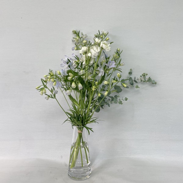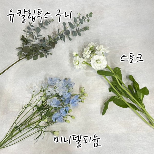 미니델피늄과 스토크, 유칼립투스 구니입니다.