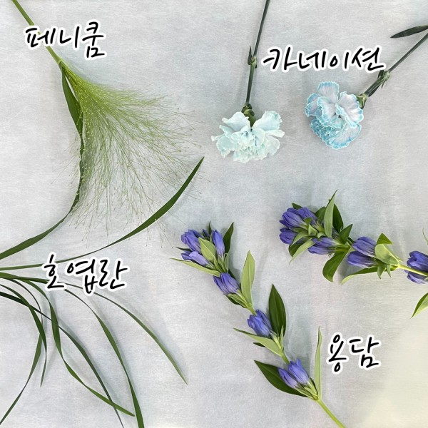 용담과 카네이션, 호엽란, 페니쿰입니다.